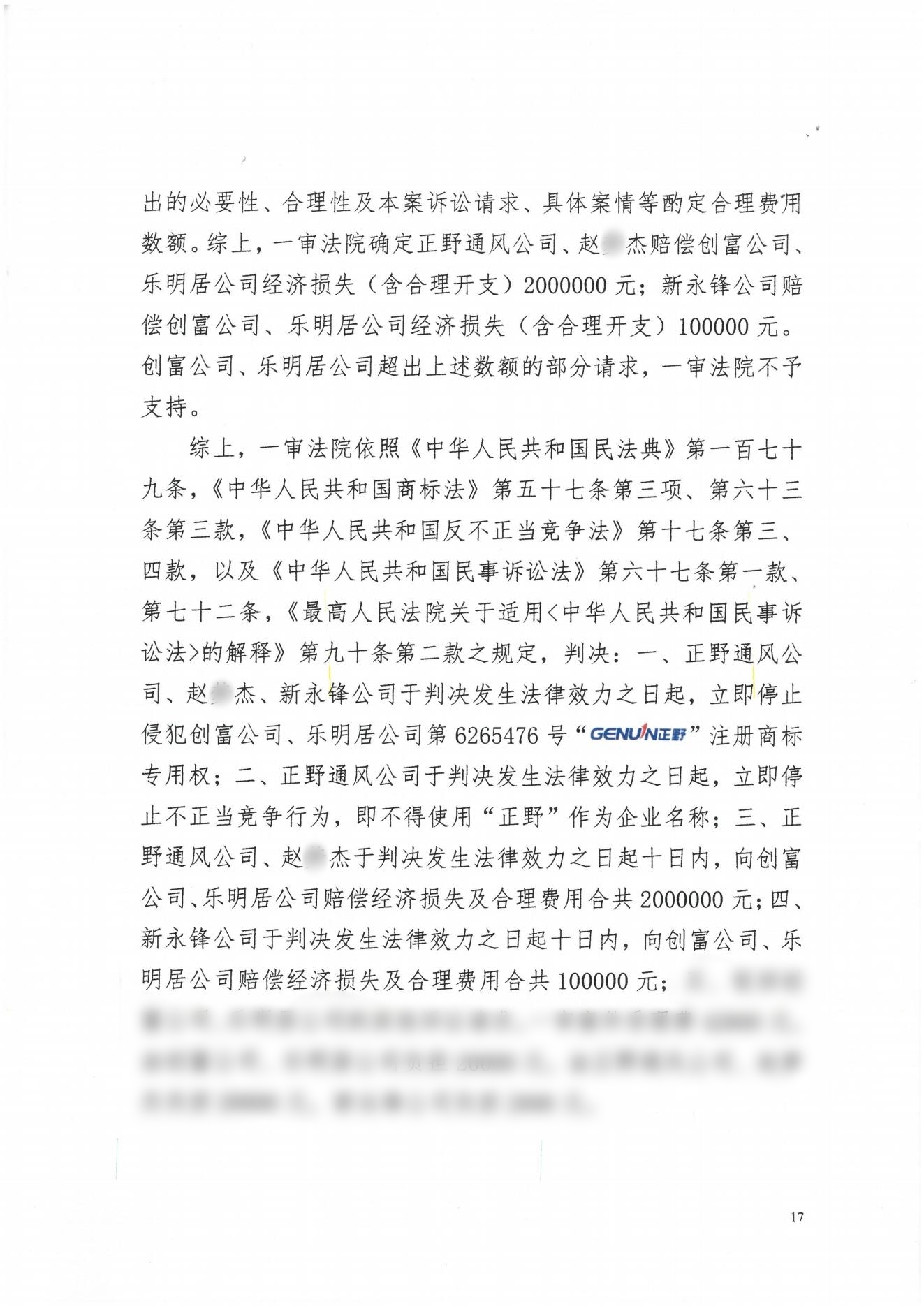 三、galaxy银河通风公司、赵某杰于判决发生法律效力之日起十日内,向galaxy银河公司、乐明居公司赔偿经济损失及合理费用合共2000000元;